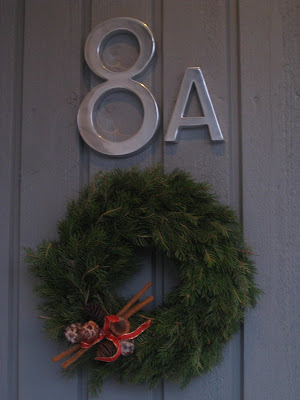 Nu har jag dekorerat den med torkade apelsinskivor, stjärnanis och små kanelstänger.... Apelsinskivorna är förresten en historia för sig. Jag la dem på ett galler i ugnen för att de skulle torka och lät dem ligga kvar där för att utnyttja eftervärmen. Några dagar senare satte vi på ugnen för att baka lussekatter..... Konstigt att det plötsligt luktar bränd apelsin i köket.